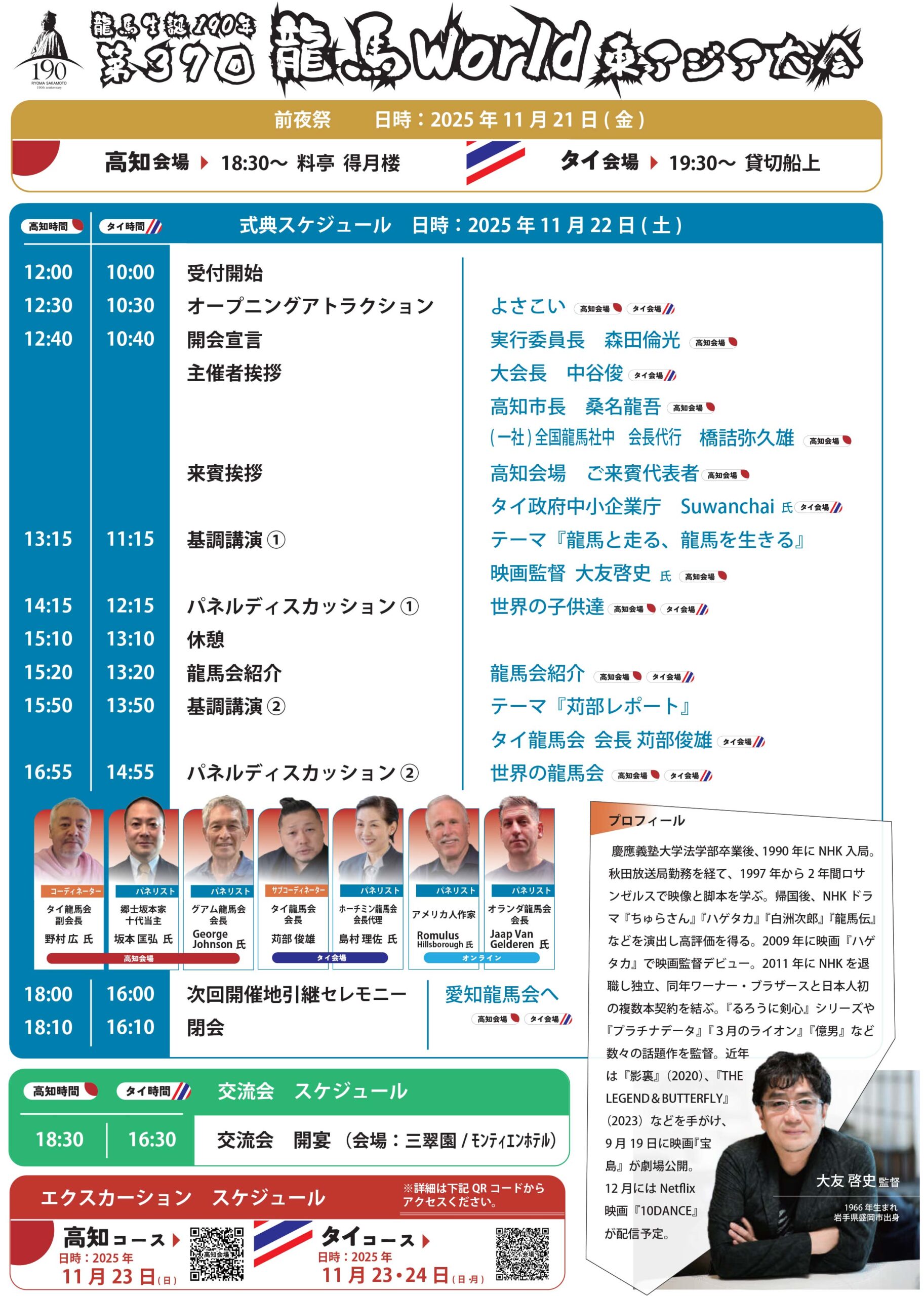 当日は、日タイ両国をはじめとするアジア各国から、龍馬の思想に共鳴する教育関係者、実業家、学生、在外邦人らが集い、国境を越えた「志の共創」が行われます。また、現地の大学生との文化交流や、日系コミュニティとの連携強化の場としても機能することを意図しています。